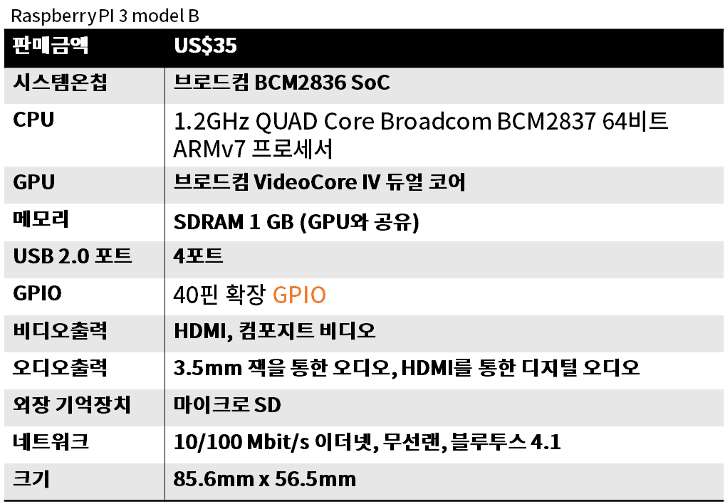 2012년 출시 이후 다양한 버전들이 나왔고, 일단 라즈베리파이3 기준으로 대략적인 스펙은 아래와 같다.