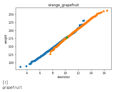 비슷한 값을 넣었지만 잘 구별하는 것으로 보여진다. 하지만 데이터셋을 2개로 나누고, 데이터셋에서 없는 완전 새로운 데이터를 넣어준 것은 아니기 때문에 이렇게 정확하게 나온 걸 수도 있다. 만약 더 정확히 확인하기 위해서는 마트에서 오렌지나 자몽을 사서 지름과 무게를 측정하여 테스트 해 보면 될 것 같다. 또 이번 예제에서는 무게와 지름에 대해 스케일링을 해주지 않고도 잘 동작했지만, 만약 고려해야하는 특징의 스케일링이 필요하다면 그부분을 추가해야 할 것이다.