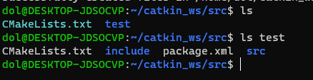 새로운 패키지를 만들기 위해 ~/catkin_ws/src로 이동한 뒤 catkin_create_pkg 스크립트를 통해 test라는 패키지를 만들어 주었다.