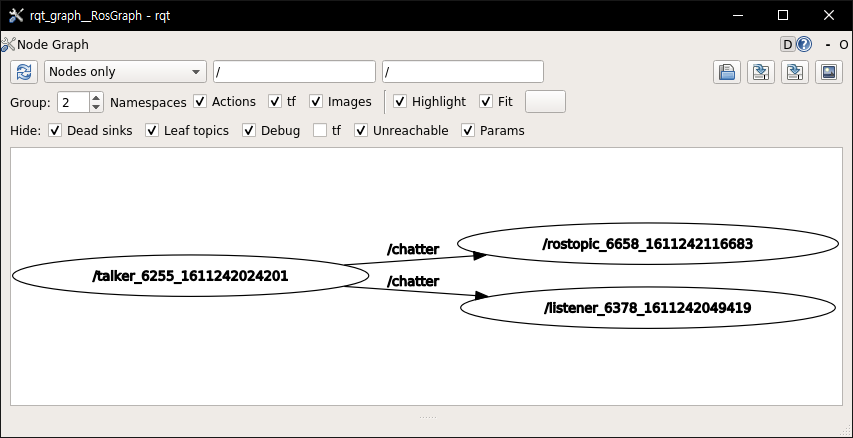 rqt_graph에서 새로고침을 실행 해주면 /talker에서 나오는 /chatter가 /rostopic 노드로도 연결 되는 것을 볼 수 있다.