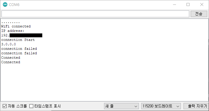 ESP-32(LOLIN D32)에서 실행한 시리얼모니터 화면은 다음과 같다.
