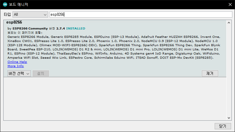 보드를 추가하기 위해 툴 -> 보드 -> 보드매니저 로 들어가서 esp32와 esp8266 보드를 설치해준다.