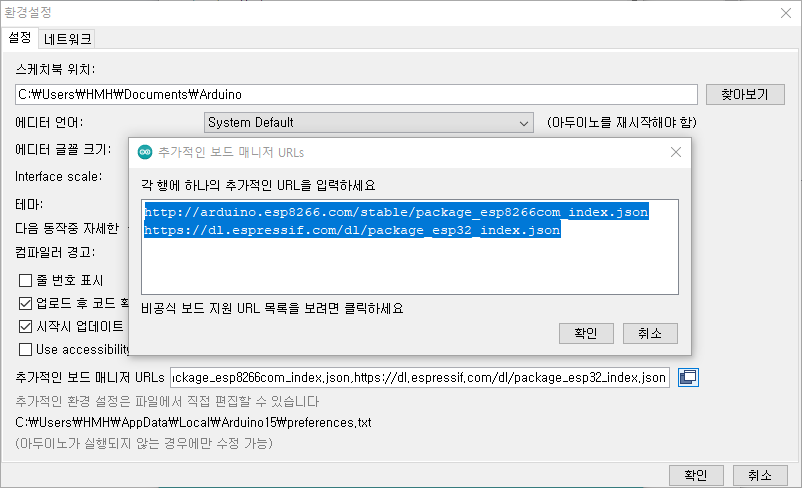 환경설정 - 추가적인보드 매니저 URLs 에 다음과 같이 두개의 URL을 추가한다.