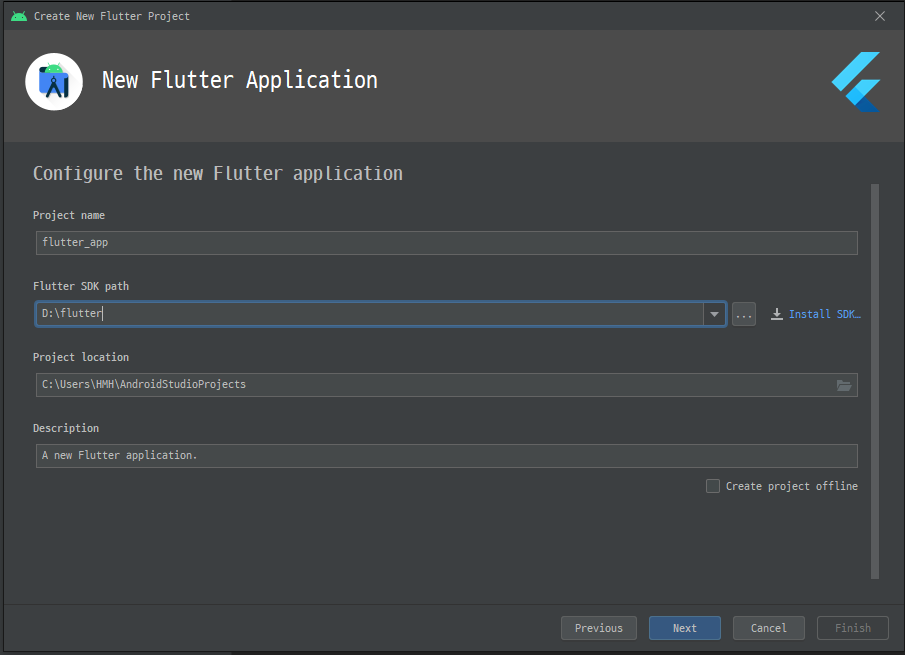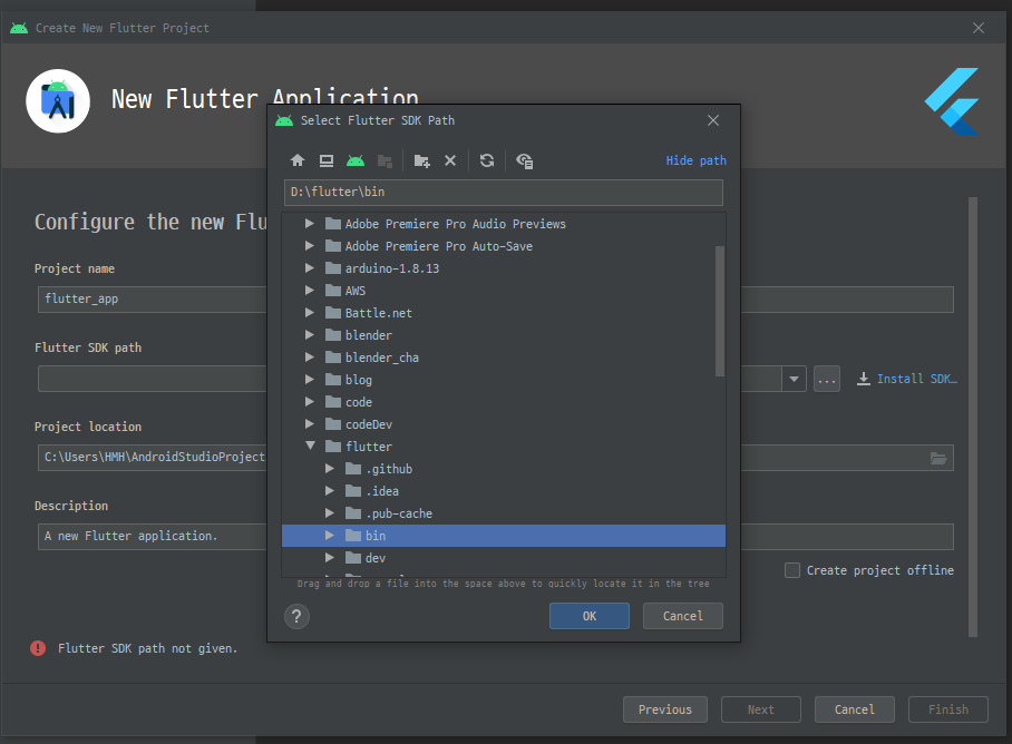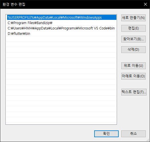 그 뒤 새로만들기 를 클릭, 압축 해제한 flutter\bin 파일의 경로를 붙여넣고 저장합니다.