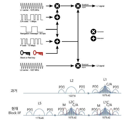 . C/A코드,P(Y)코드,M코드 등이대역확산된신호 송출 (주로, 군사용으로만 사용)