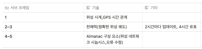 - 메세지전송속도 : 30초당 1개 메세지 프레임(각 프레임은 위성 원자시계의 분 또는 30분에 시작)